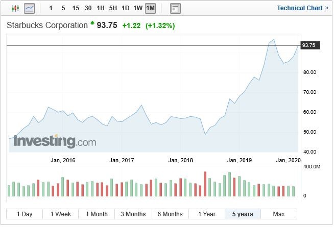 다시 스타벅스로 돌아와서 2016, 2017, 2018년을 살펴보면 3년간 스타벅스의 주가는 빠지거나 고전을 하는 모습을 보입니다.